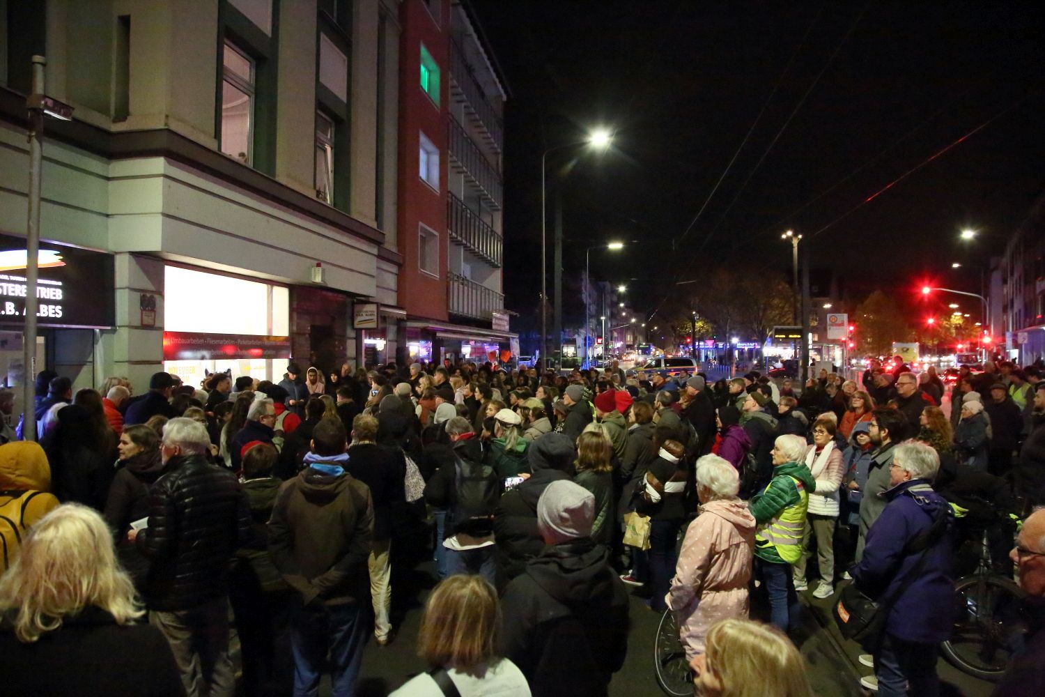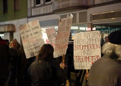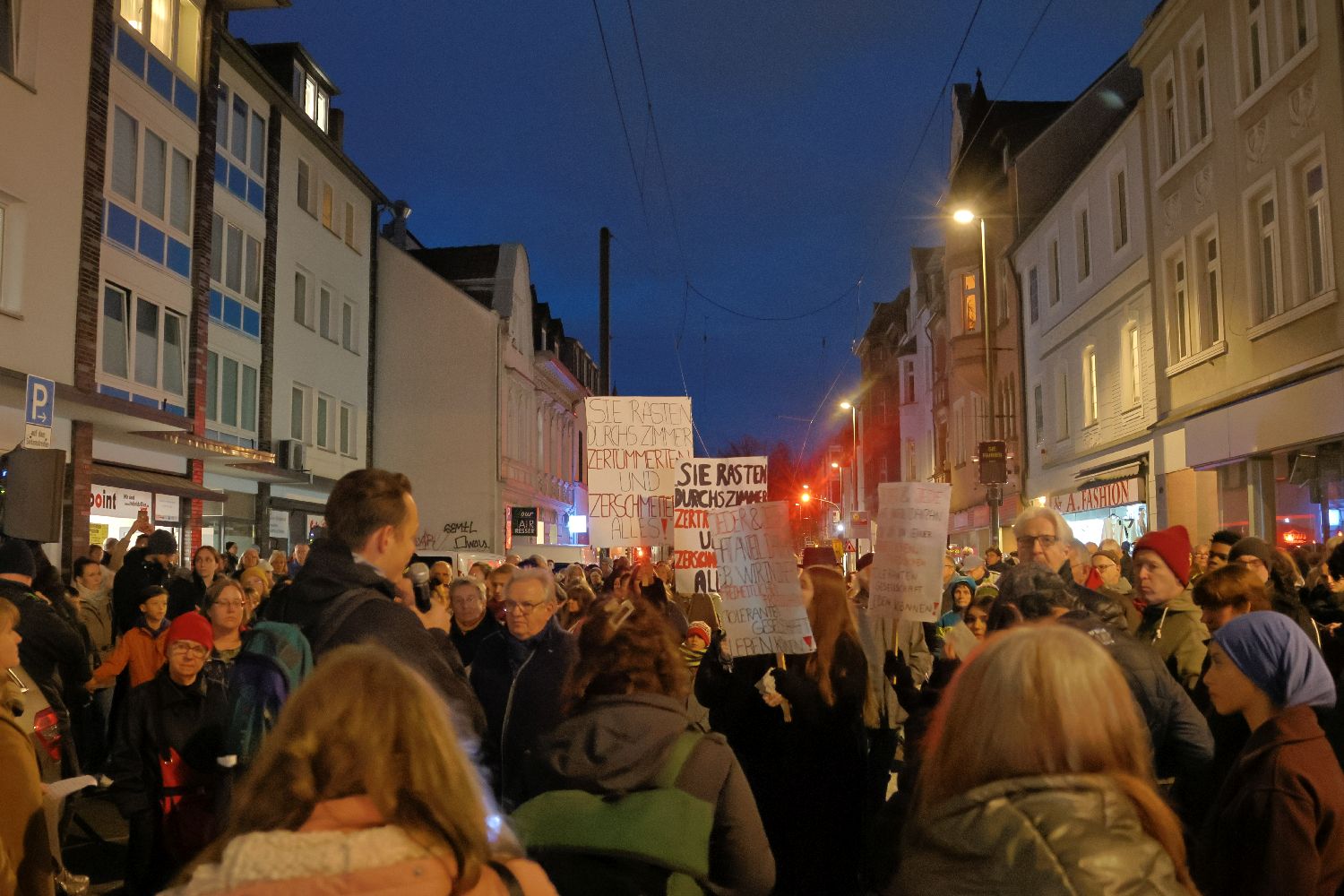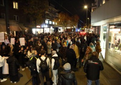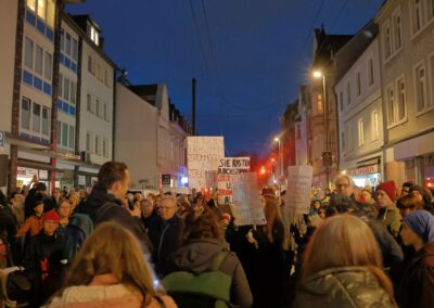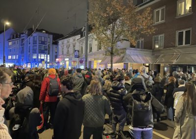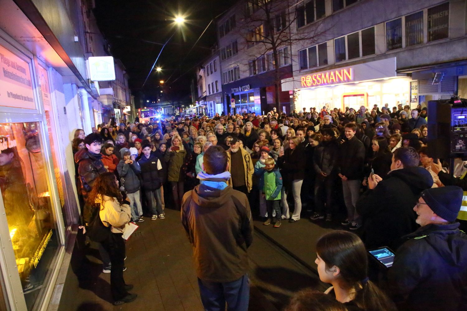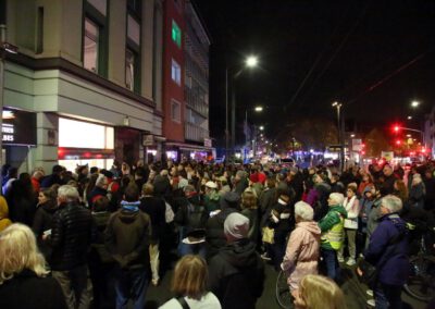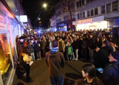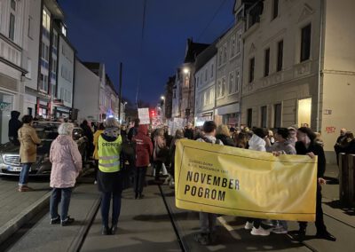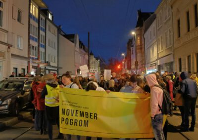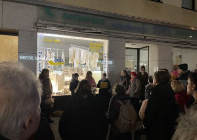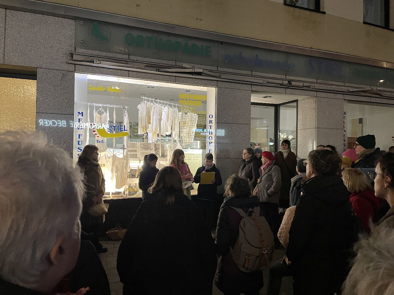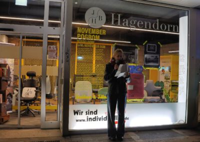 Insgesamt nahmen ca. 600 Menschen, darunter 100 Schülerinnen und Schüler der Lore-Lorentz-Schule, an der Gedenkveranstaltung teil. Dank der Unterstützung der heutigen Geschäftsinhaber/-innen werden die Produkte der Schüler/-innen in den Schaufenstern noch bis zum 23.11. zu sehen sein.