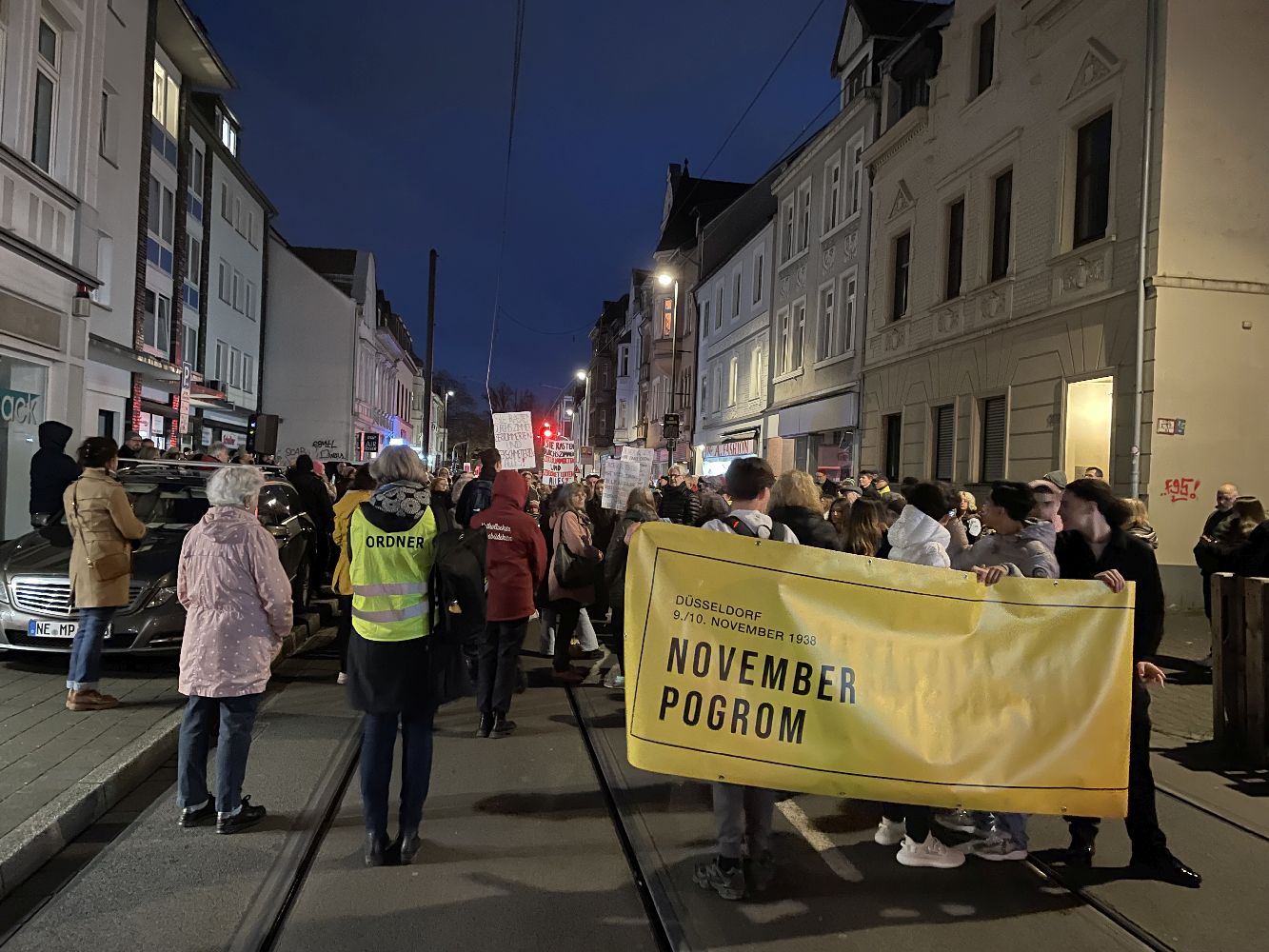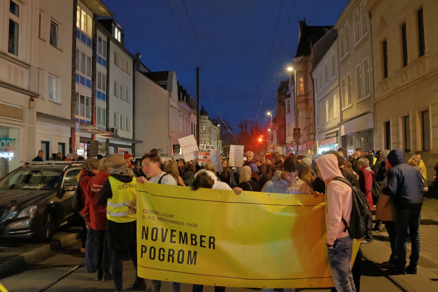 Am 9./10. November jährte sich die sogenannte Pogromnacht. Eine Nacht, in der in einer von den Nationalsozialisten angeordneten Aktion brutal und gewaltvoll gegenüber jüdischen Bürgerinnen und Bürgern vorgegangen wurde; zahlreiche Synagogen wurden in Brand gesetzt, Geschäfte geplündert und zerstört, jüdische Nachbarinnen und Nachbarn angegriffen. Allein in Düsseldorf gab es in der Nacht vom 9. auf den 10. November 1938 450 Überfälle, 70 Verletzte und 30 Tote. Vor unserer Schulhaustür, im Stadtteil Eller, wurden auf der Gumbertstraße, auf der heute die Linie U75 fährt, fünf Wohn- und Geschäftshäuser verwüstet.