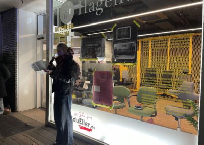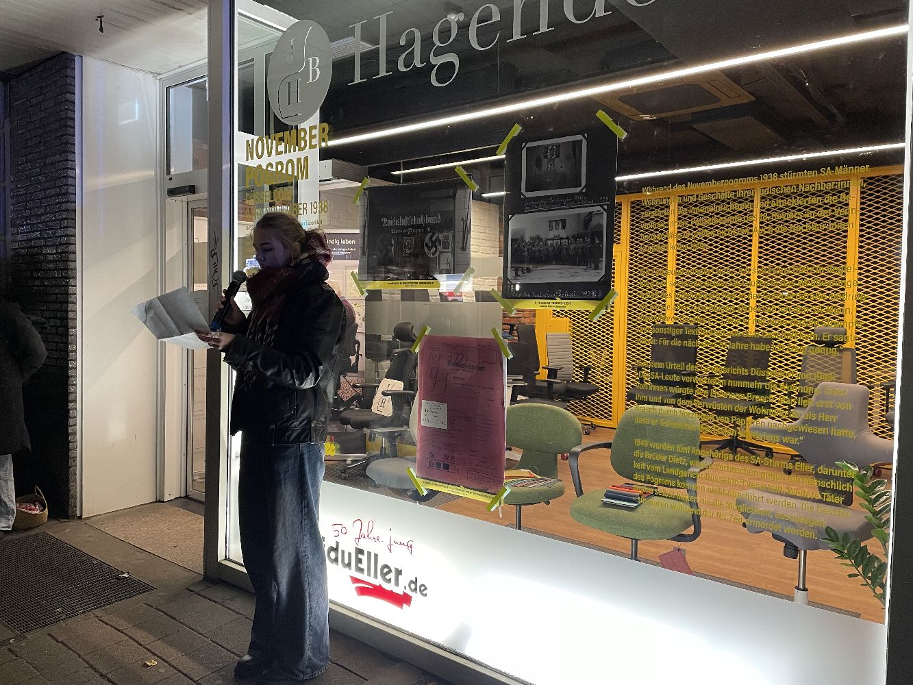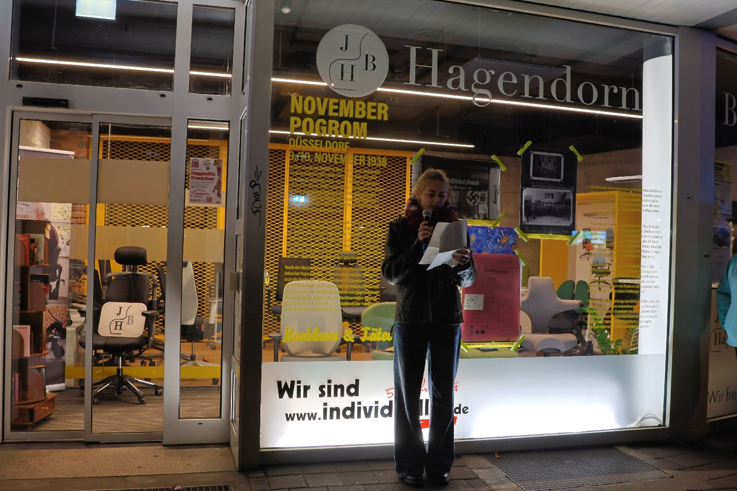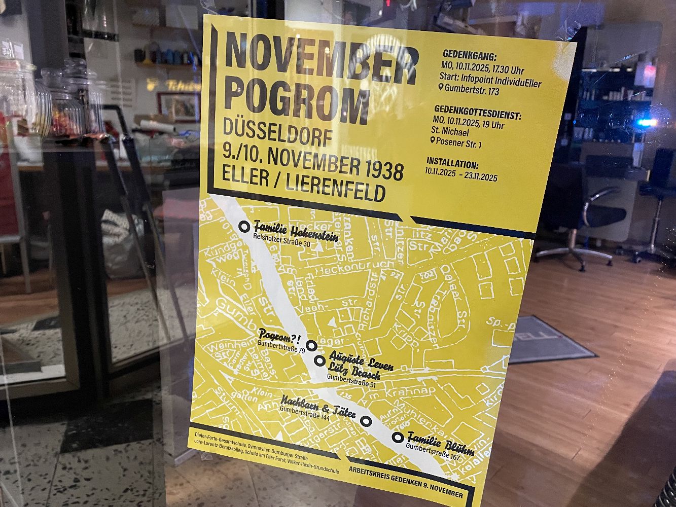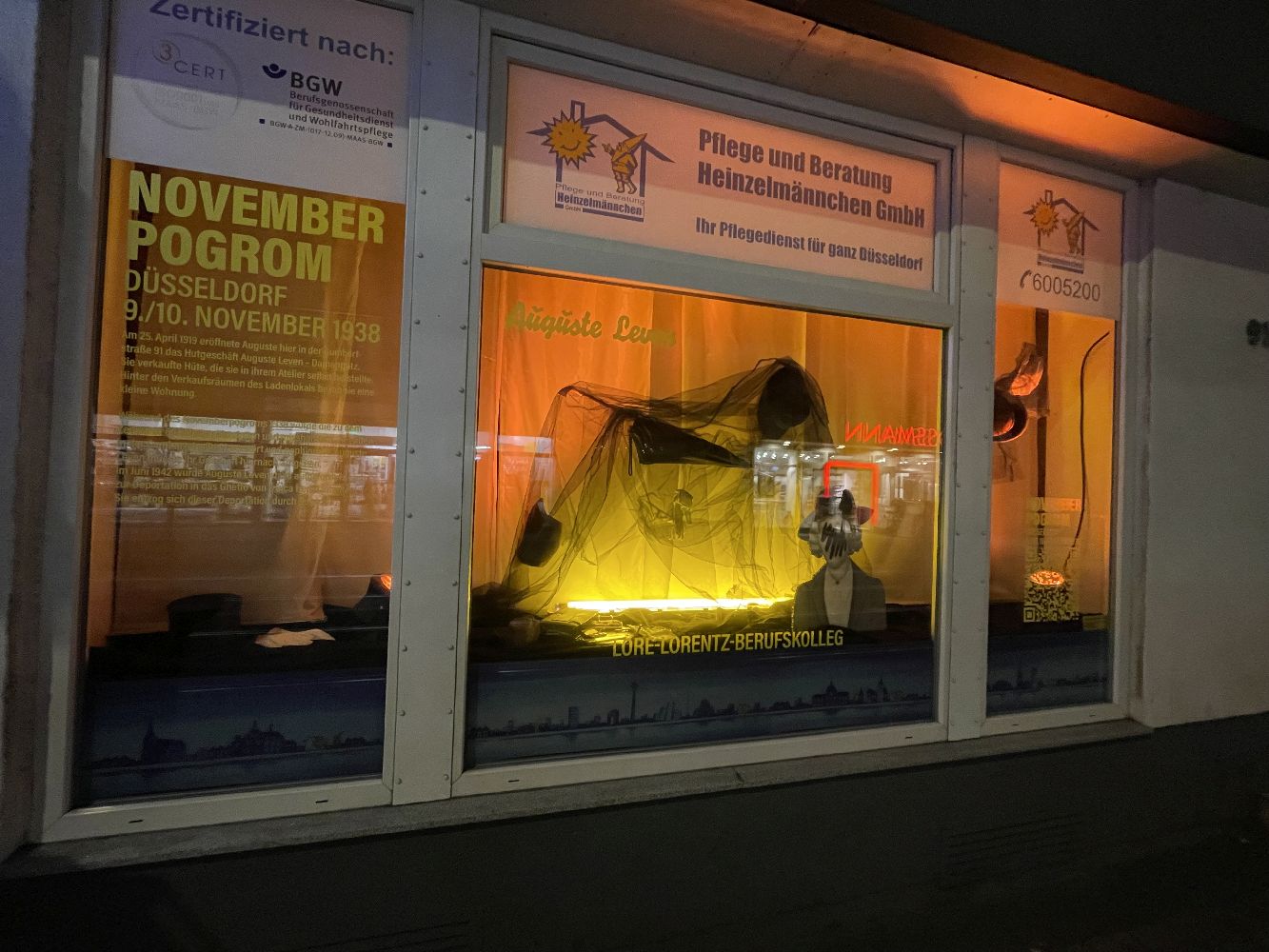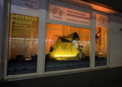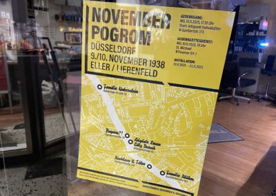 87 Jahre nach der Pogromnacht gibt es kaum noch Zeitzeugen, die von diesen Überfällen berichten können. Der Arbeitskreis 9. November* hat sich zum Ziel gesetzt, die Erinnerung in den Düsseldorfer Stadtteilen wachzuhalten und zusammen mit Schulen ein deutliches Zeichen für das Gedenken vor Ort zu setzen. Gemeinsam wirkten Schülerinnen und Schüler der Lore-Lorentz-Schule, des Gymnasiums Bernburger Straße, der Volker-Rosin-Grundschule, der Schule am Eller Forst und der Dieter-Forte-Gesamtschule an der Gestaltung des „Gedenkganges“ in den Stadtteilen Eller und Lierenfeld am 10. November mit. An fünf historischen Wohn- und Geschäftsorten gestalteten Schüler/-innen Schaufenster und recherchierten das Schicksal der jüdischen Bewohnerinnen und Bewohner sowie der Ereignisse während des Pogroms.